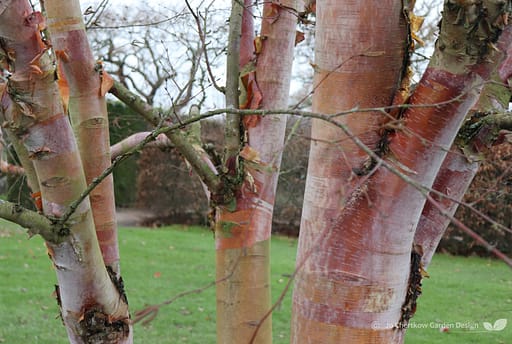 Consider the less common birch Betulus albosinensis with its burnished pinky bark or for richer colour Prunus serrula.