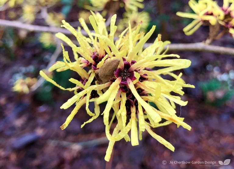 For smaller gardens Hamamelis can be pruned to keep it small, or consider training it against a dark wall or hedge where the bright flowers will contrast in winter.